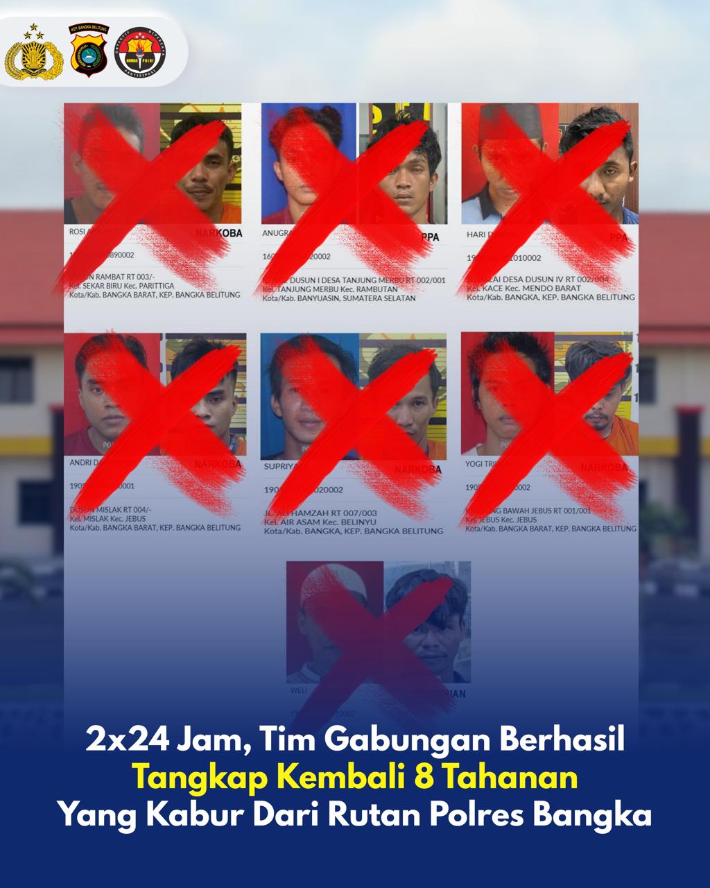 Dalam waktu 2×24 jam, tim gabungan berhasil menangkap kembali delapan tahanan yang sebelumnya melarikan diri dari Rumah Tahanan (Rutan) Polres Bangka.