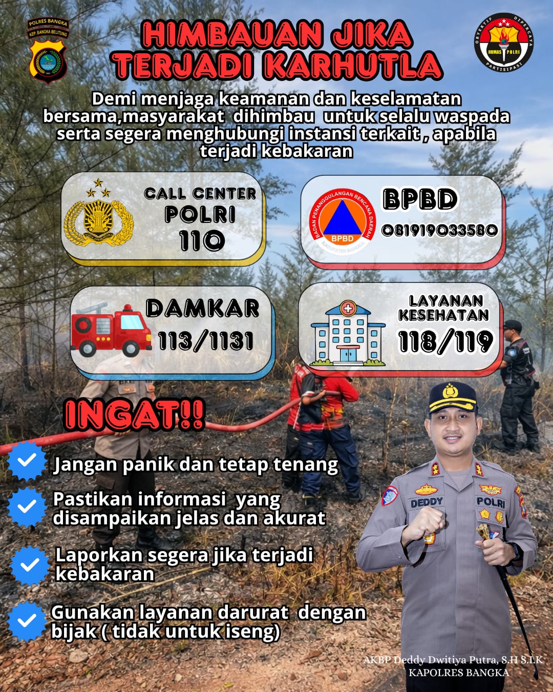 Polres Bangka juga mengingatkan masyarakat untuk memanfaatkan layanan darurat secara bijak. Sejumlah nomor penting yang dapat dihubungi di antaranya Call Center Polri 110, BPBD, Dinas Pemadam Kebakaran di 113/1131, serta layanan kesehatan di 118/119.